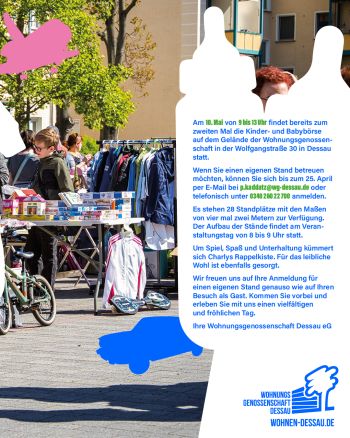 Am 10. Mai von 9 bis 13 Uhr findet bereits zum zweiten Mal die Kinder- und Babybörse auf dem Gelände der Wohnungsgenossenschaft in der Wolfgangstraße 30 in Dessau statt.