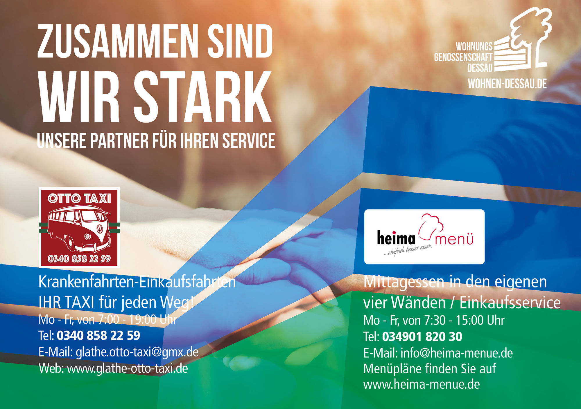 Liebe Mieter, derzeit ist das öffentliche Leben in Dessau-Roßlau stark eingeschränkt. Busse und Bahnen fahren nur eingeschränkt. Wir sind auch weiterhin für Sie da. Damit Sie wichtige Termine, wie Arztbesuche oder die Versorgung mit Waren des täglichen Bedarfs, wahrnehmen können, bieten Ihnen unsere Partner, folgende Serviceleistungen an.